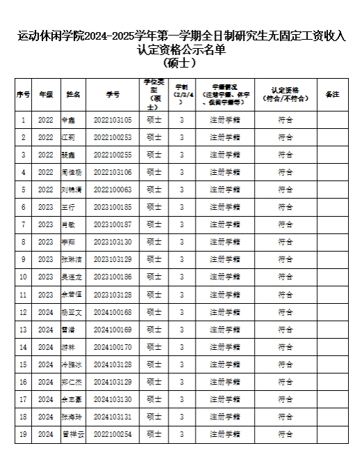XK星空2024-2025学年第一学期全日制研究生无固定工资收入认定资格公示名单 (硕士)